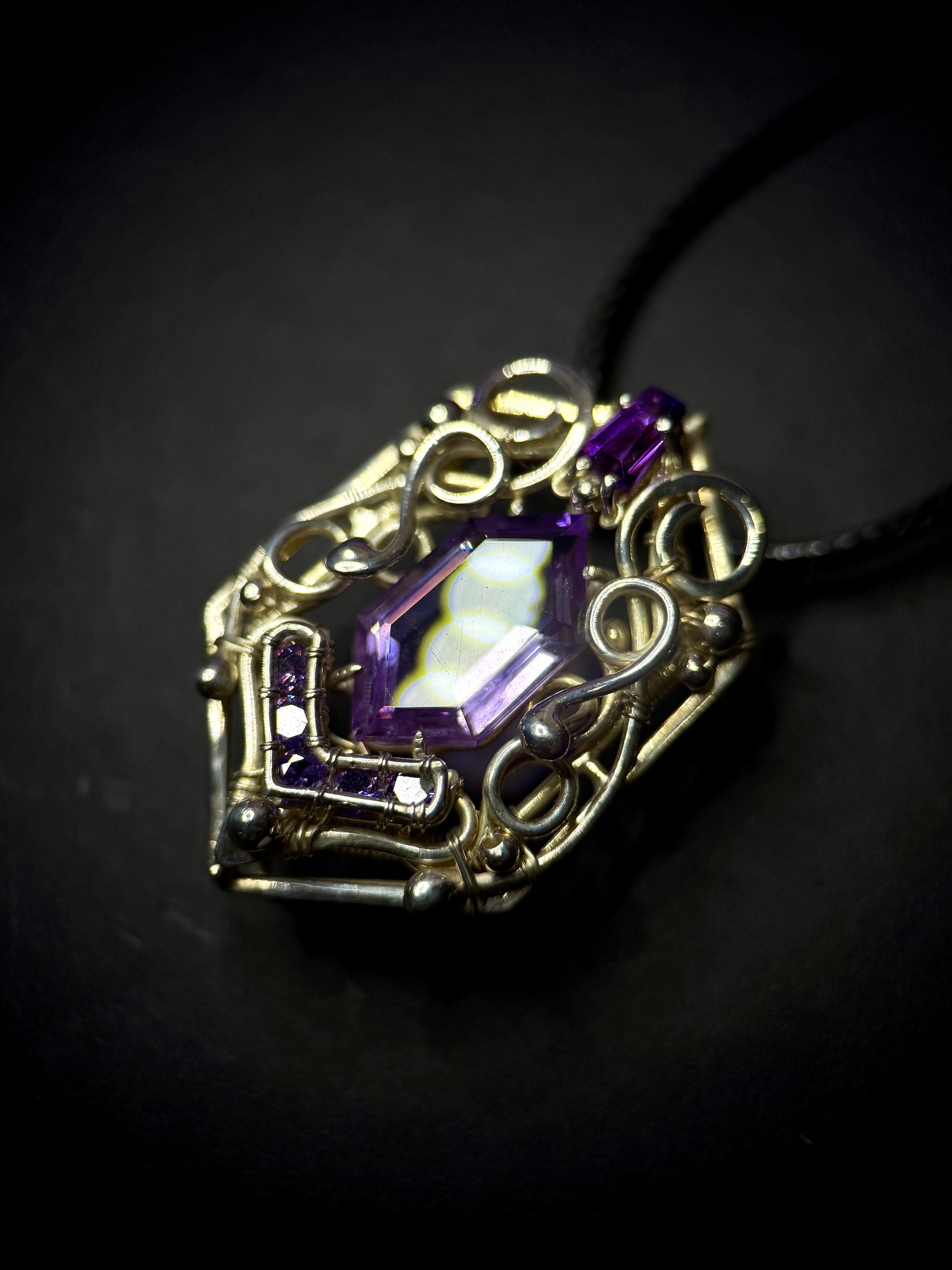 This handcrafted pendant blends geometric elegance with flowing artistry. Designed in sterling silver, it features a striking hexagon-cut amethyst at its center, symbolizing clarity and strength. Inspired by the shape of a royal crest, the pendant contrasts bold lines with delicate wire-wrapped curves and swirls, creating a harmonious balance of structure and grace.