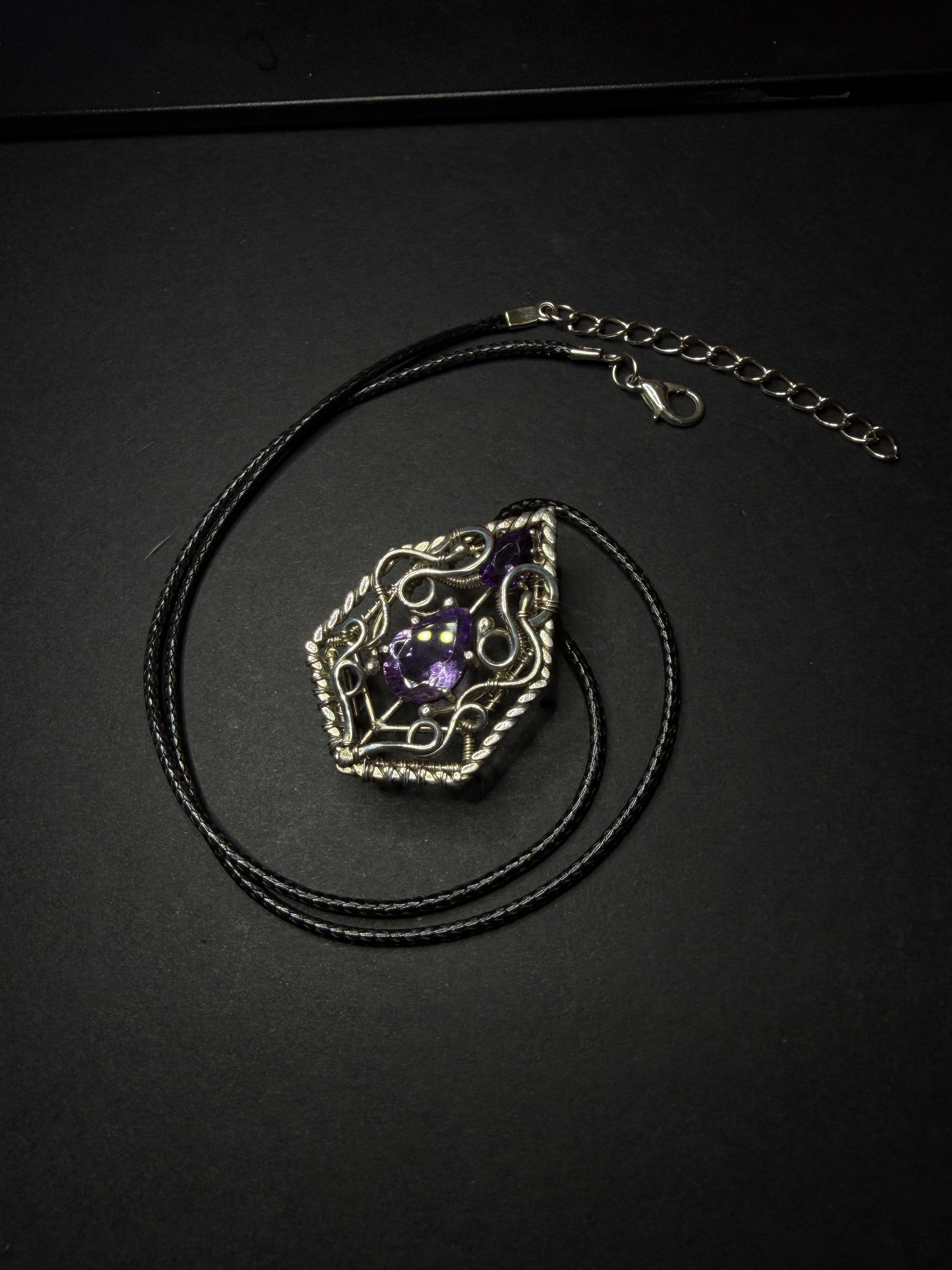 The pendant’s hexagonal shield base offers a structured, regal foundation, while delicate wire-wrapped swirls dance across its surface—creating a striking contrast between symmetry and movement.