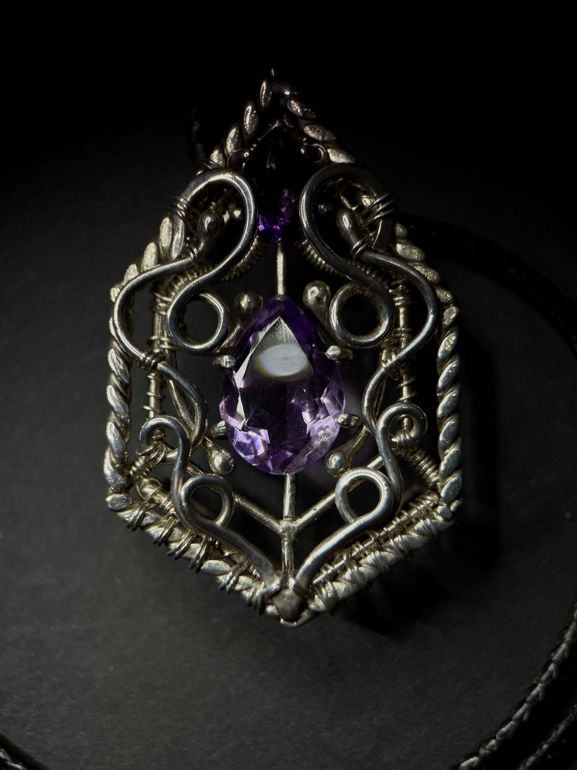 Graceful and bold, this handcrafted sterling silver pendant blends geometric precision with flowing artistry. At its heart lies a light purple pear-shaped amethyst, radiating calm and clarity.