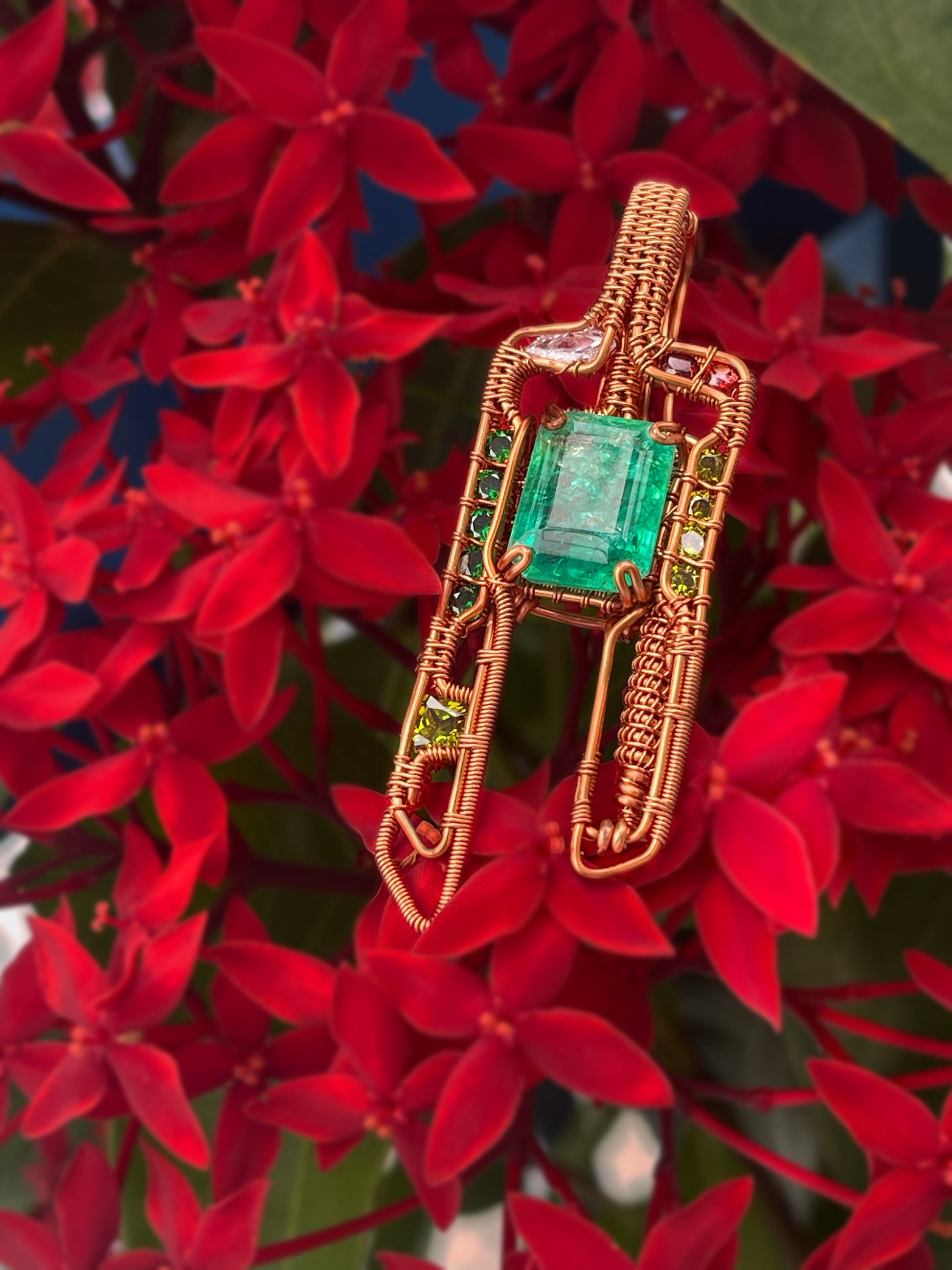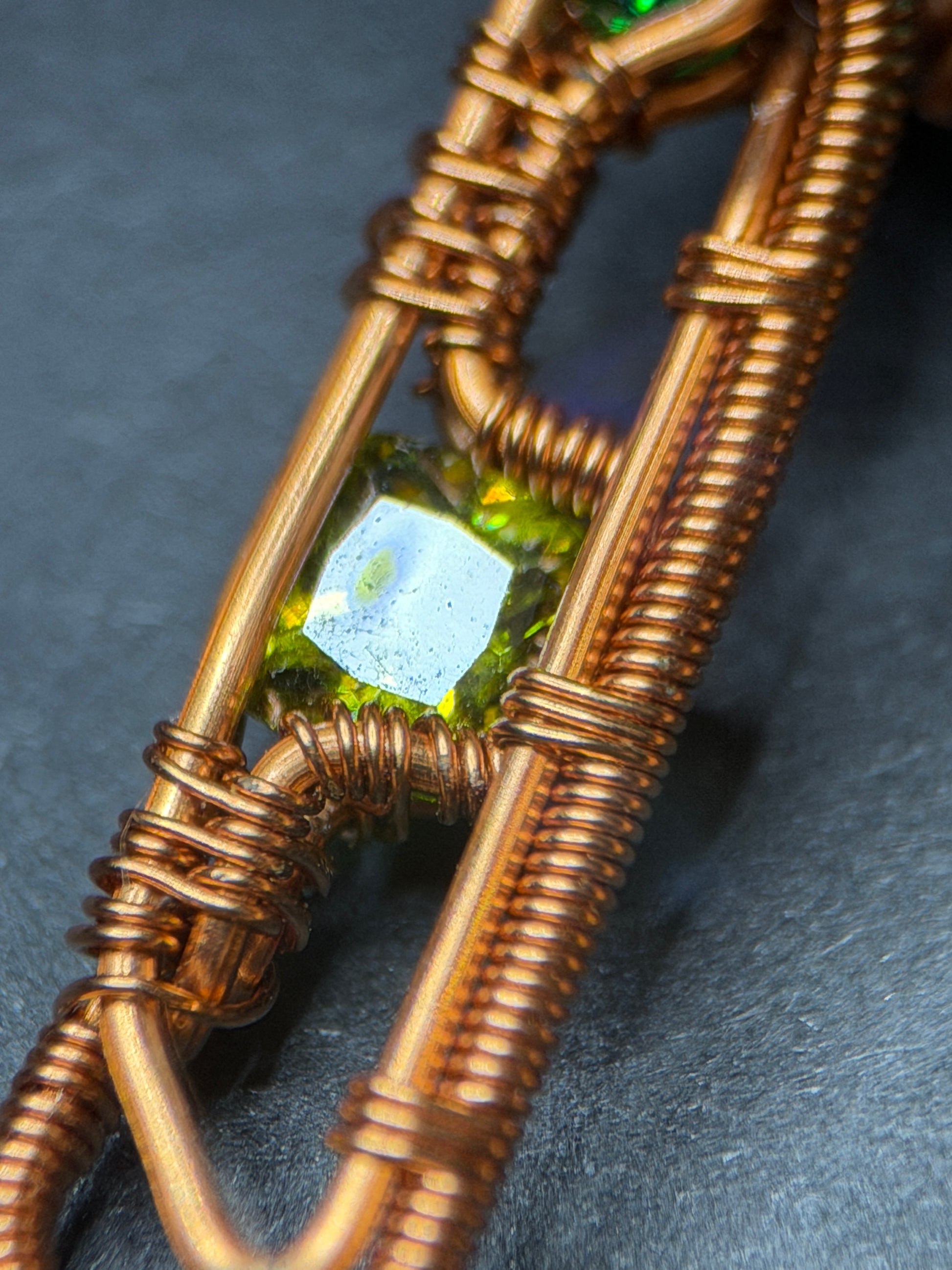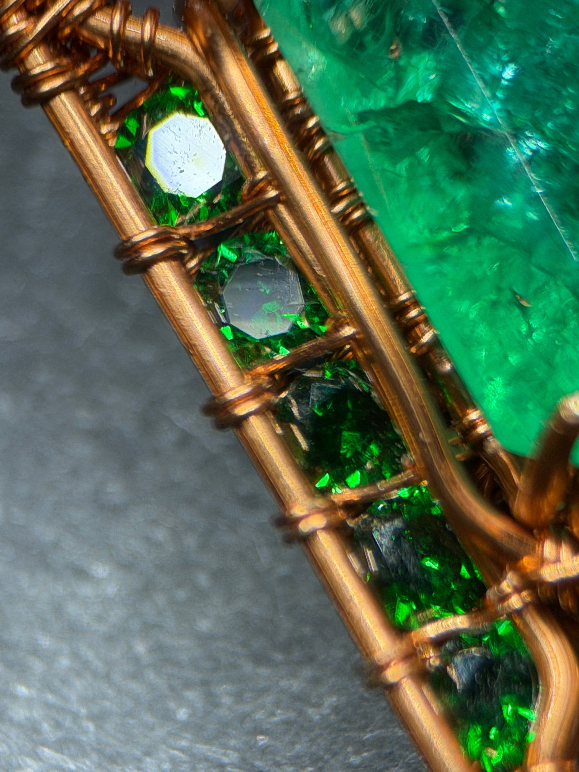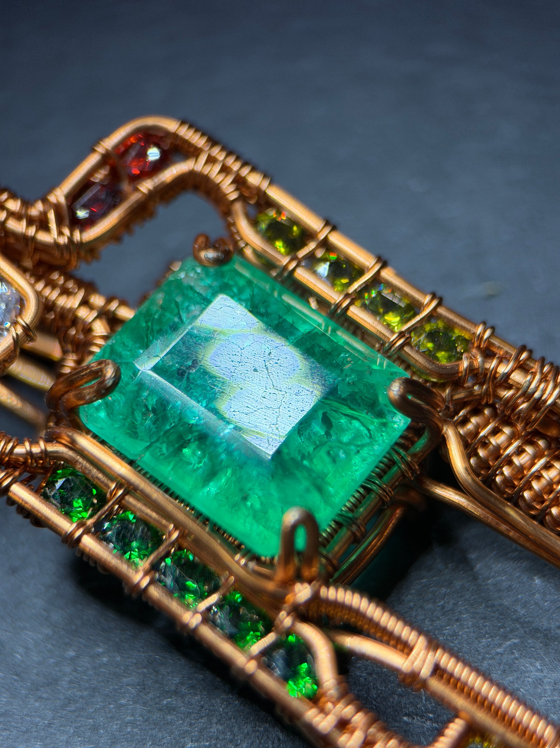 At the heart of the pendant is a vibrant emerald simulant, glowing with rich green tones that enhance its otherworldly aesthetic. Tiny cubic zirconia accents add a touch of sparkle, while the warm copper wire wrapping completes the look with an antique, elemental feel.