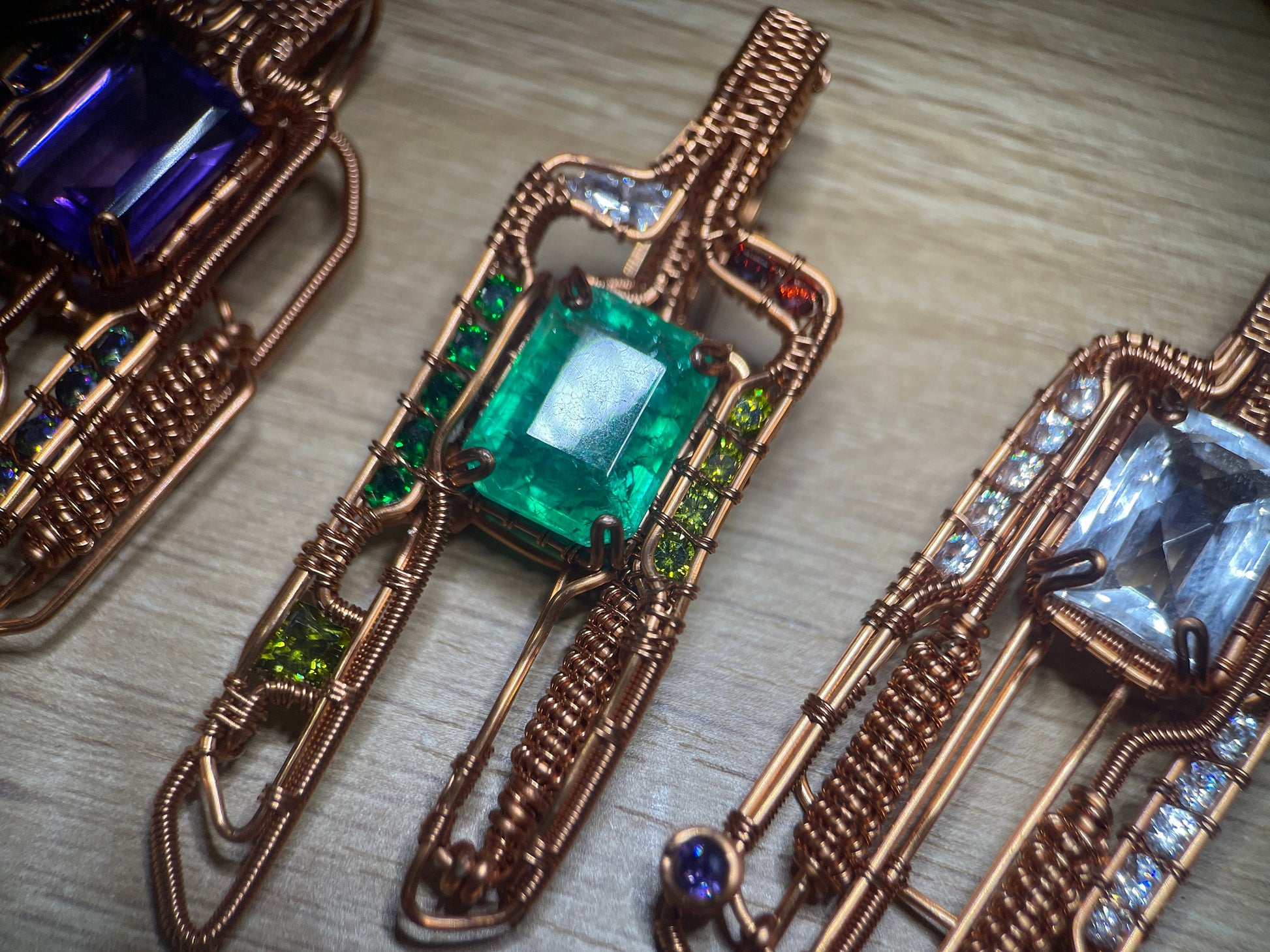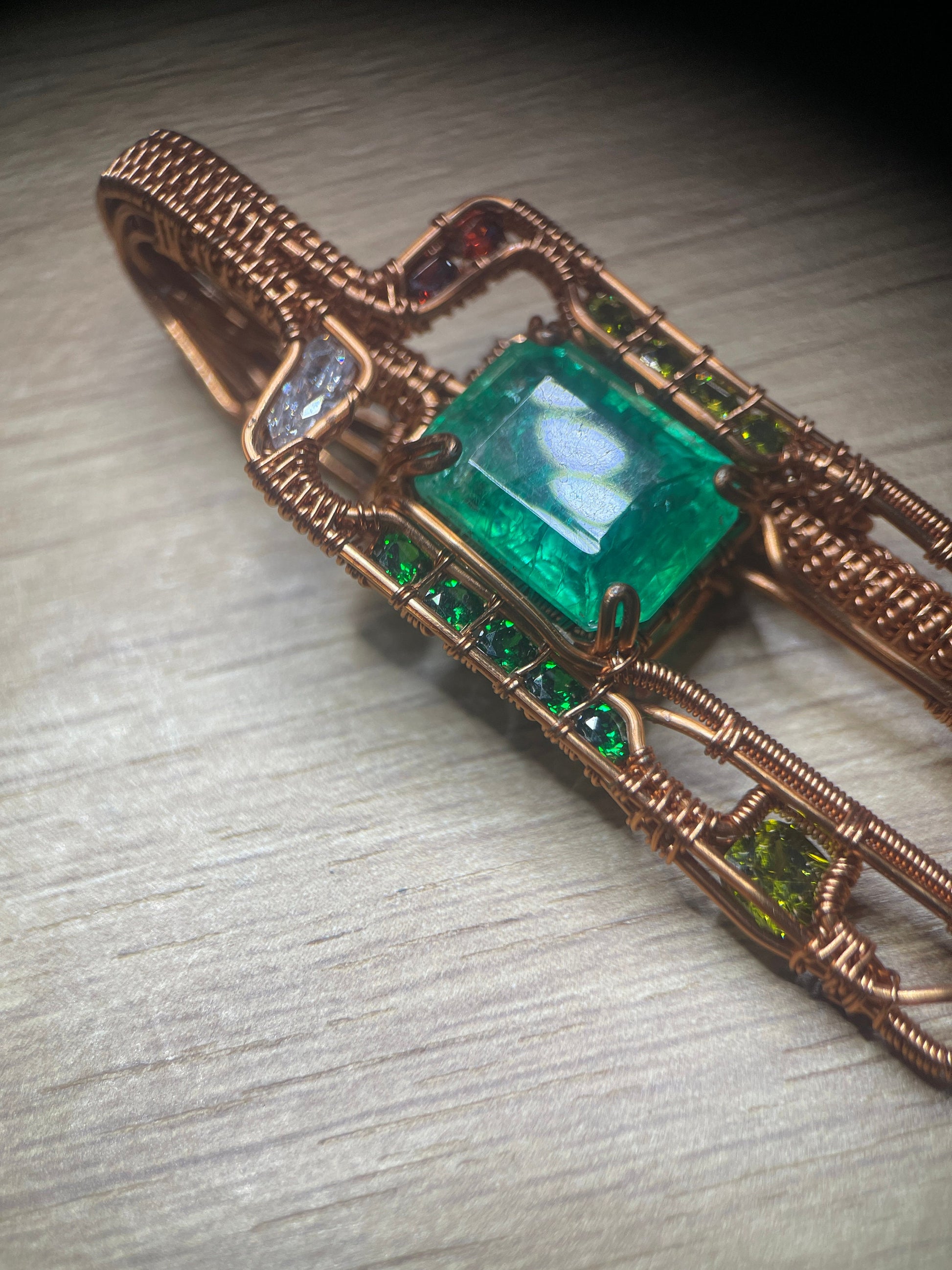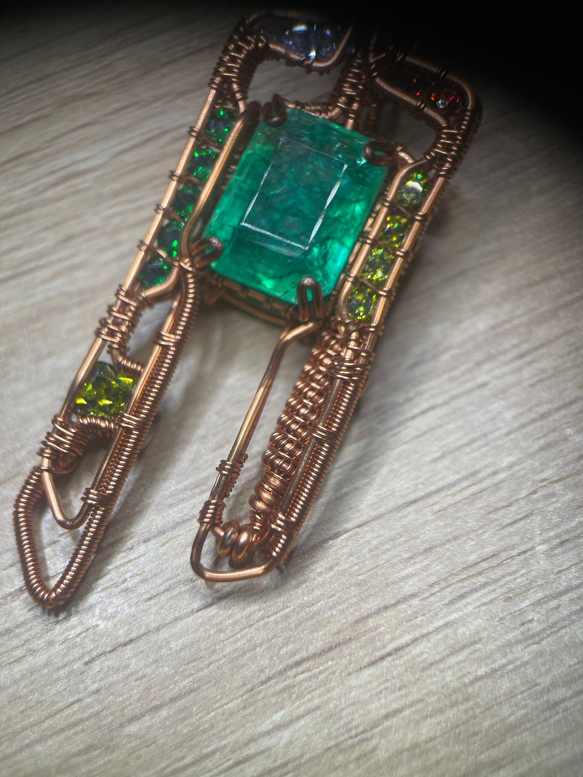 Handcrafted Copper Wire Wrap Pendant with Emerald Simulant