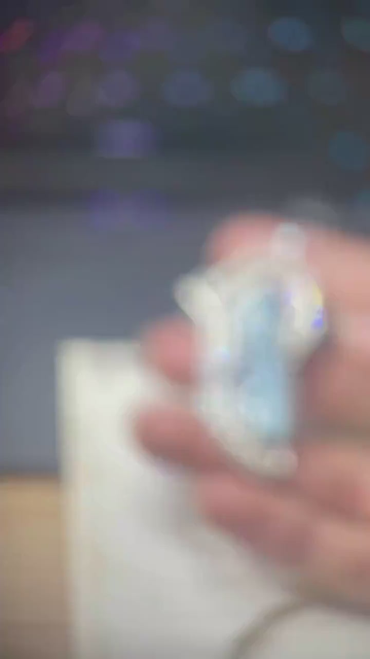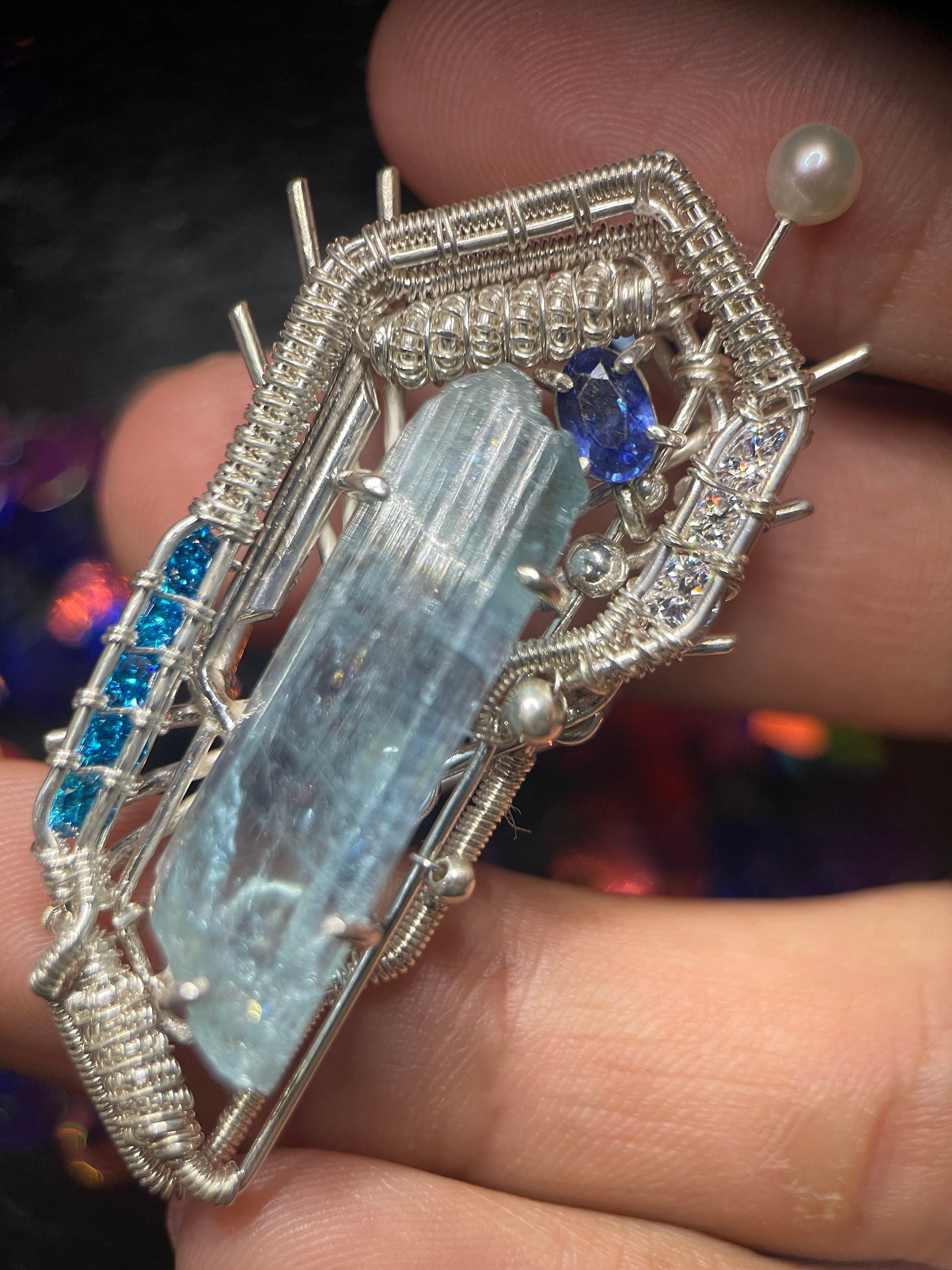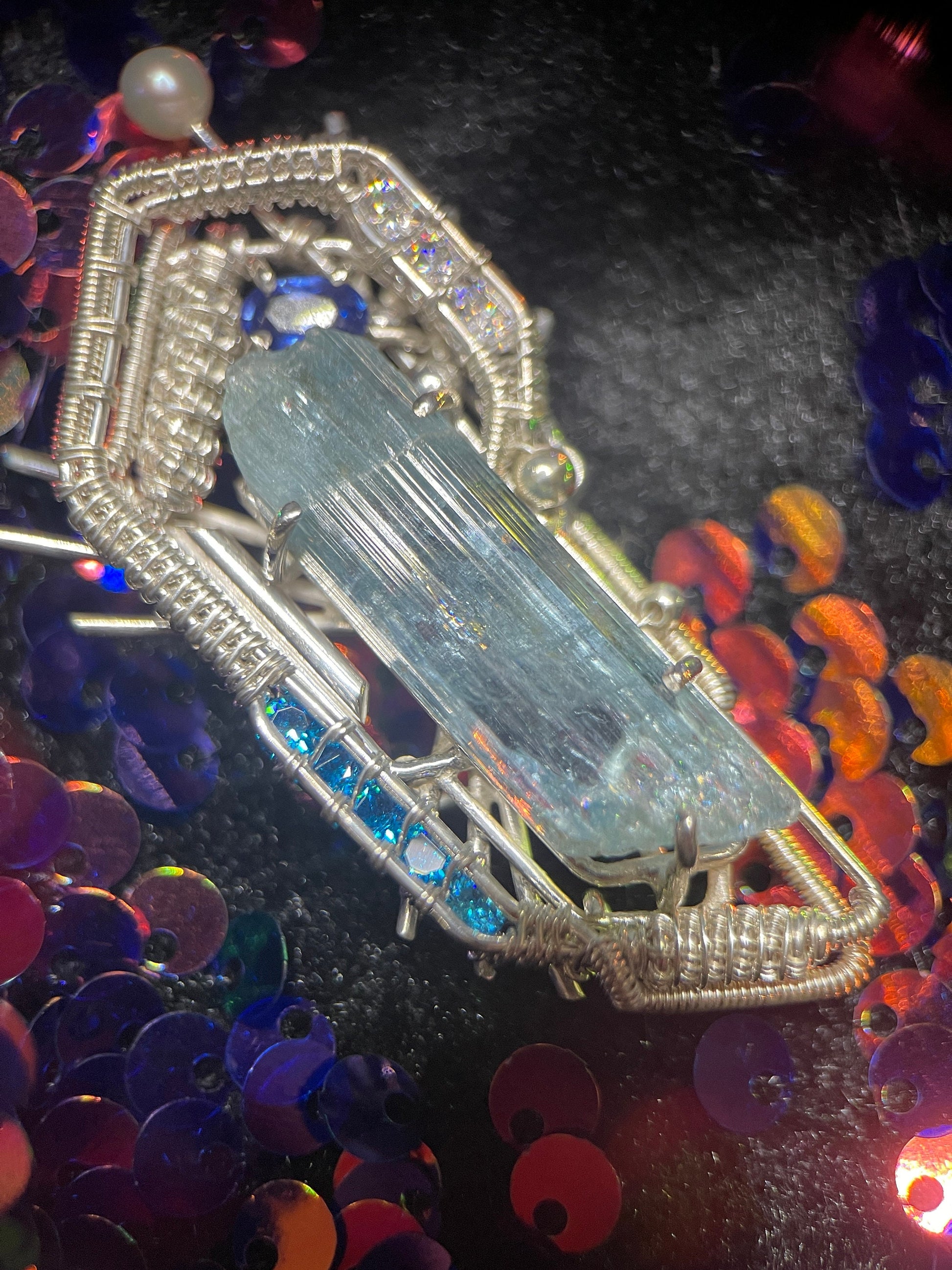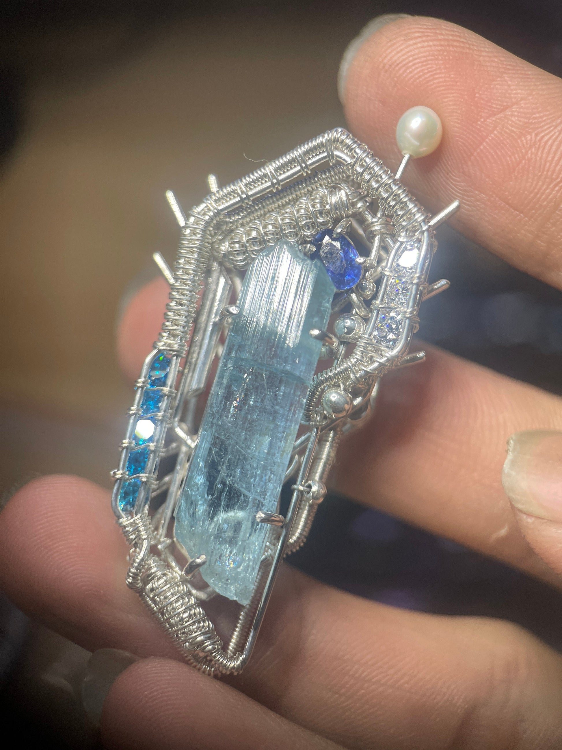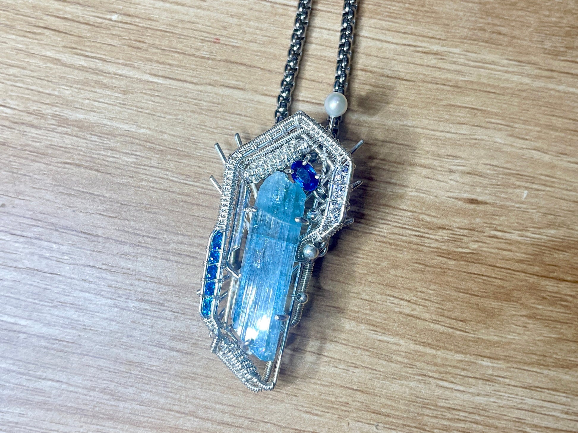 At the center is a large raw aquamarine crystal from Vietnam, known for its beautiful color and clarity. To bring out more shades of blue, I added a small blue sapphire and two rows of blue cubic zirconia for extra sparkle. A cultured pearl tops the piece like a tiny antenna, completing the sci-fi look.