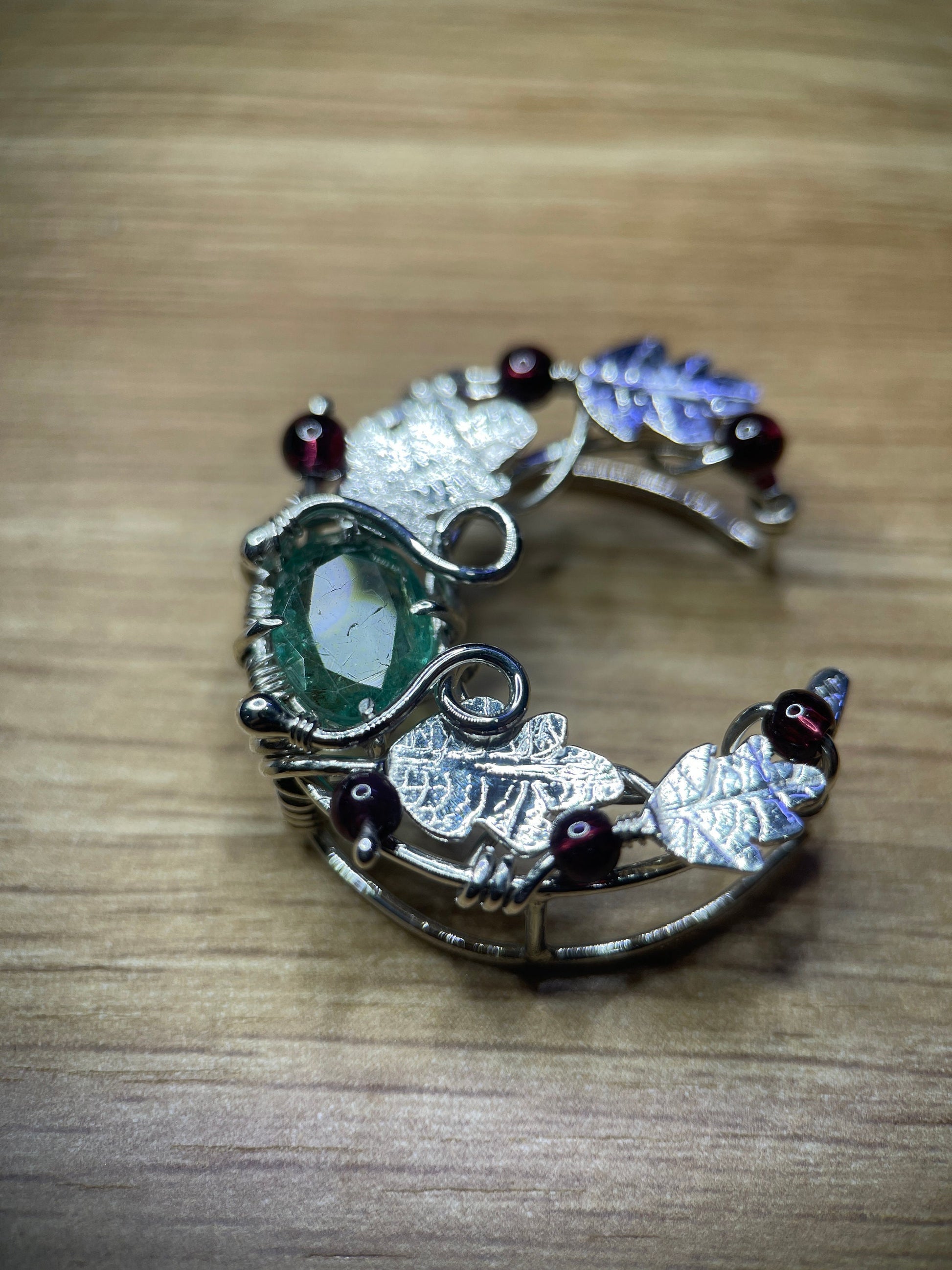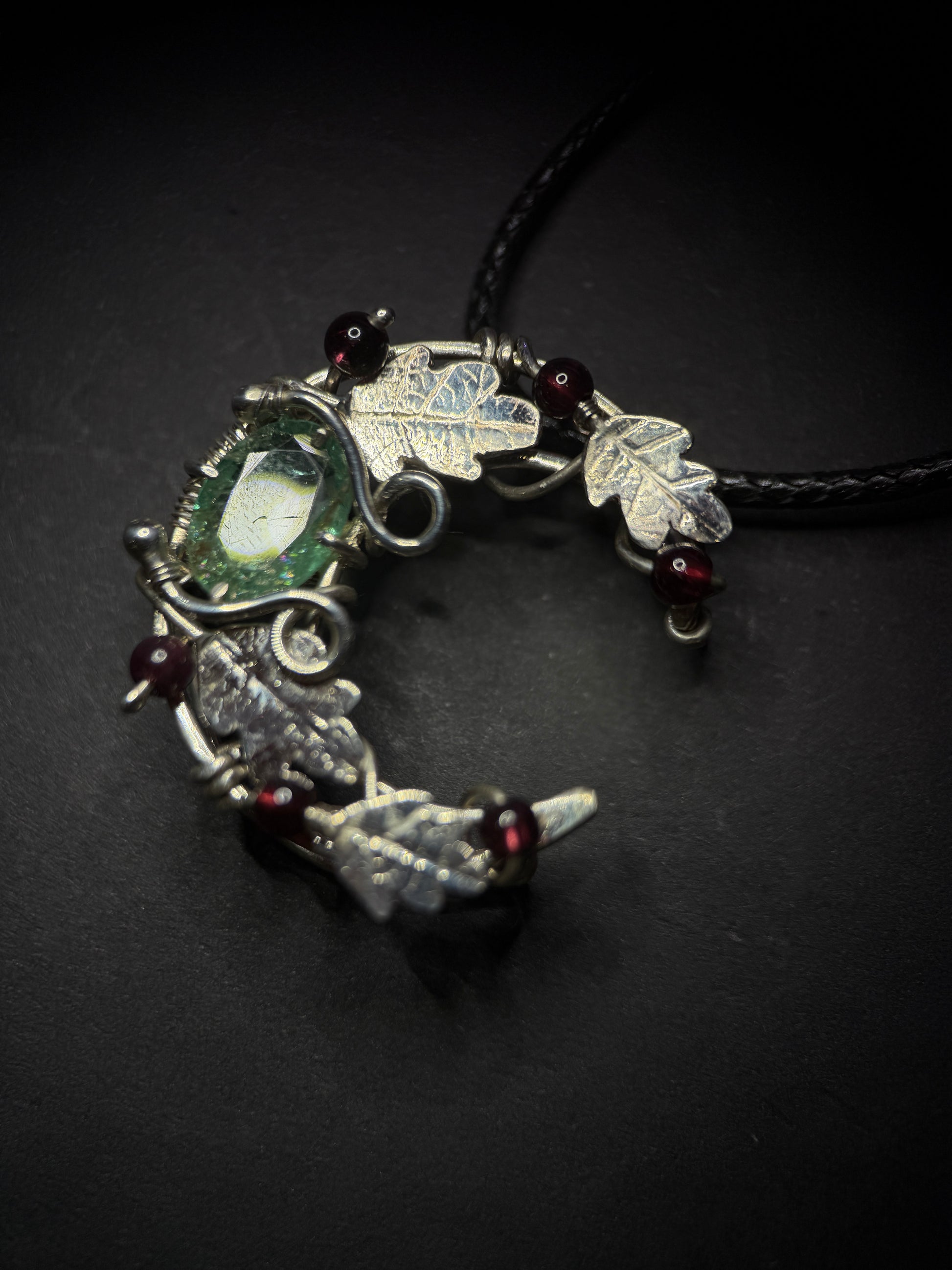 Accented with rich garnet beads—like tiny red fruits nestled among the leaves—the design brings a festive, almost Christmas-like charm. Elegant, unique, and full of character, this pendant is perfect for those who love meaningful, nature-inspired jewelry.