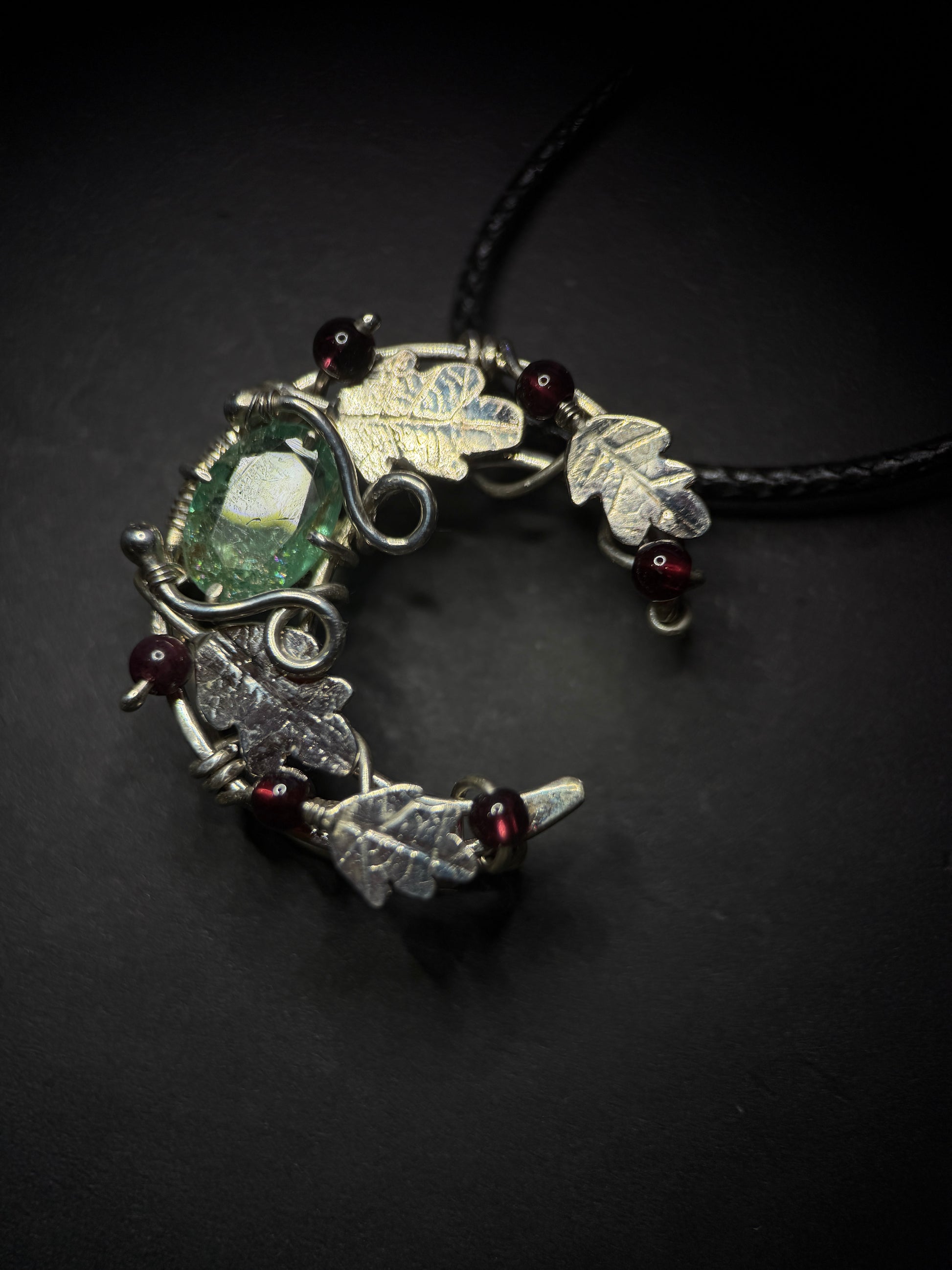 This handcrafted wire-wrapped pendant captures the quiet beauty of nature in a celestial form. Shaped like a crescent moon and made entirely of sterling silver, it features a pale green natural emerald as its centerpiece, framed by silver oak-like leaves that evoke a peaceful forest branch.