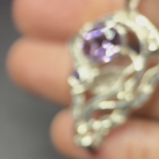 A radiant amethyst gemstone adds a touch of midnight magic, its soft purple hue reminiscent of nightfall settling over an autumn forest. The gemstoneās gentle sparkle brings warmth and depth to the piece.