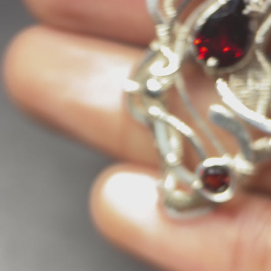 Deep red garnet gemstones are nestled into the design, adding warmth and richness. Their vibrant glow evokes the fiery hues of autumn foliage, bringing a touch of passion and elegance to the piece.