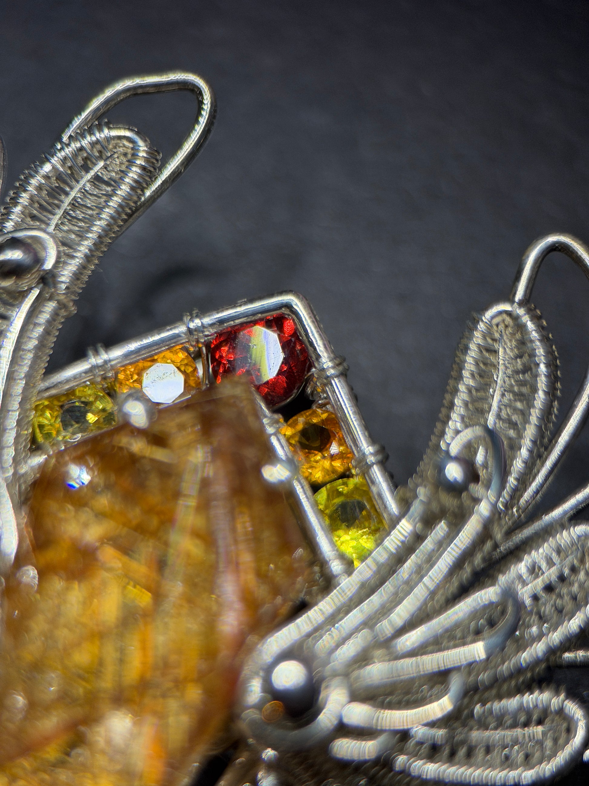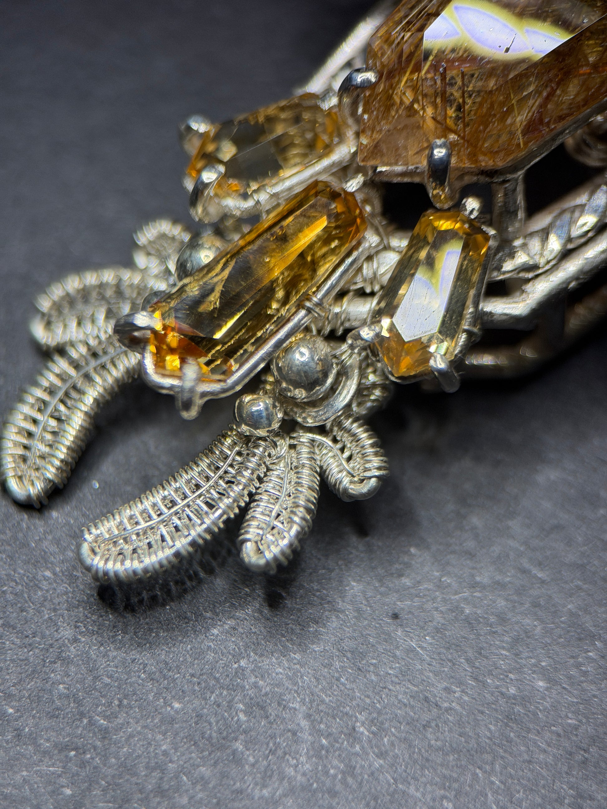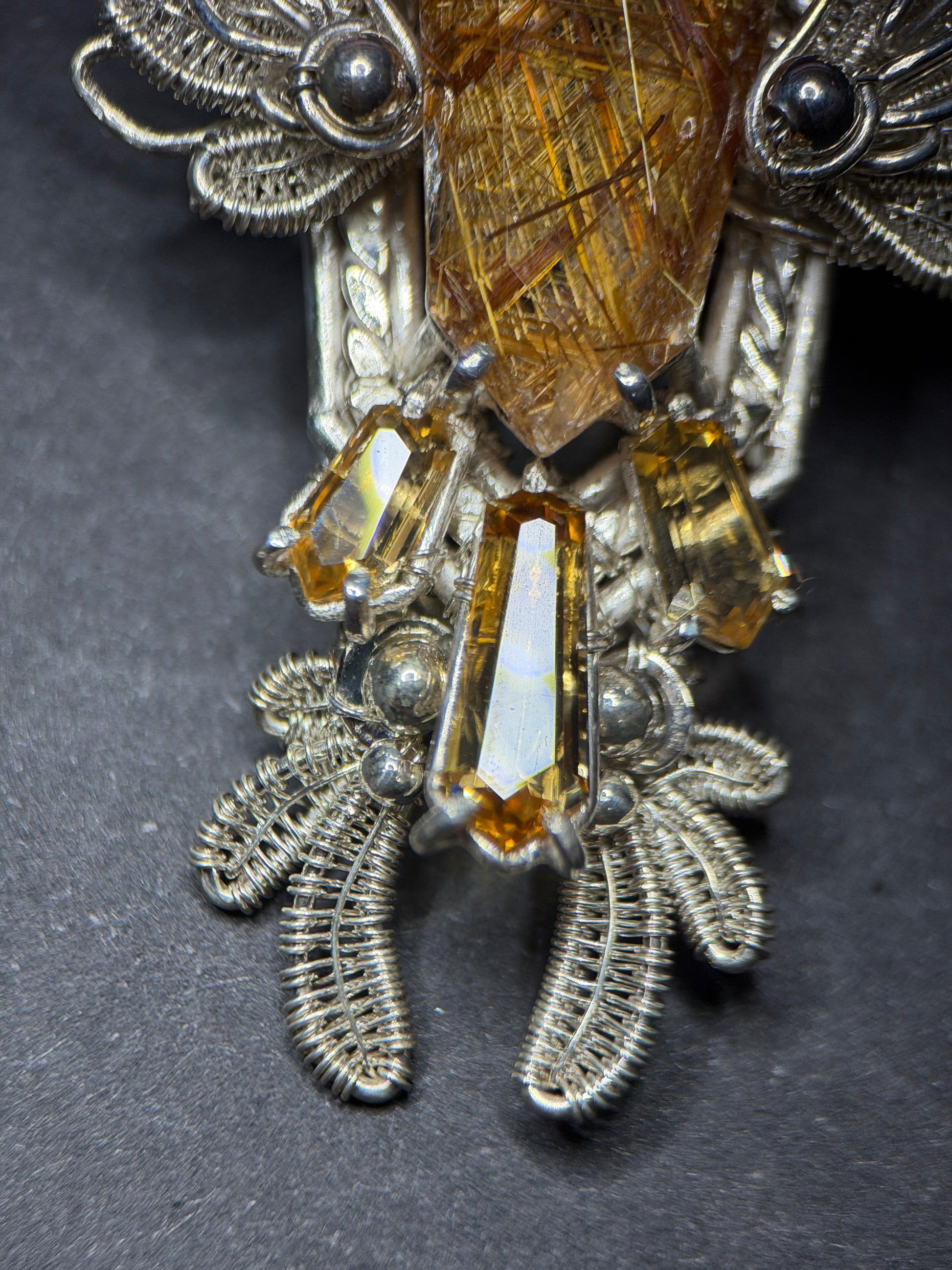 Celestial Guardian – Handmade Sterling Silver Wire wrap Pendant/Brooch with Rutilated Quartz, Citrine & Sapphire