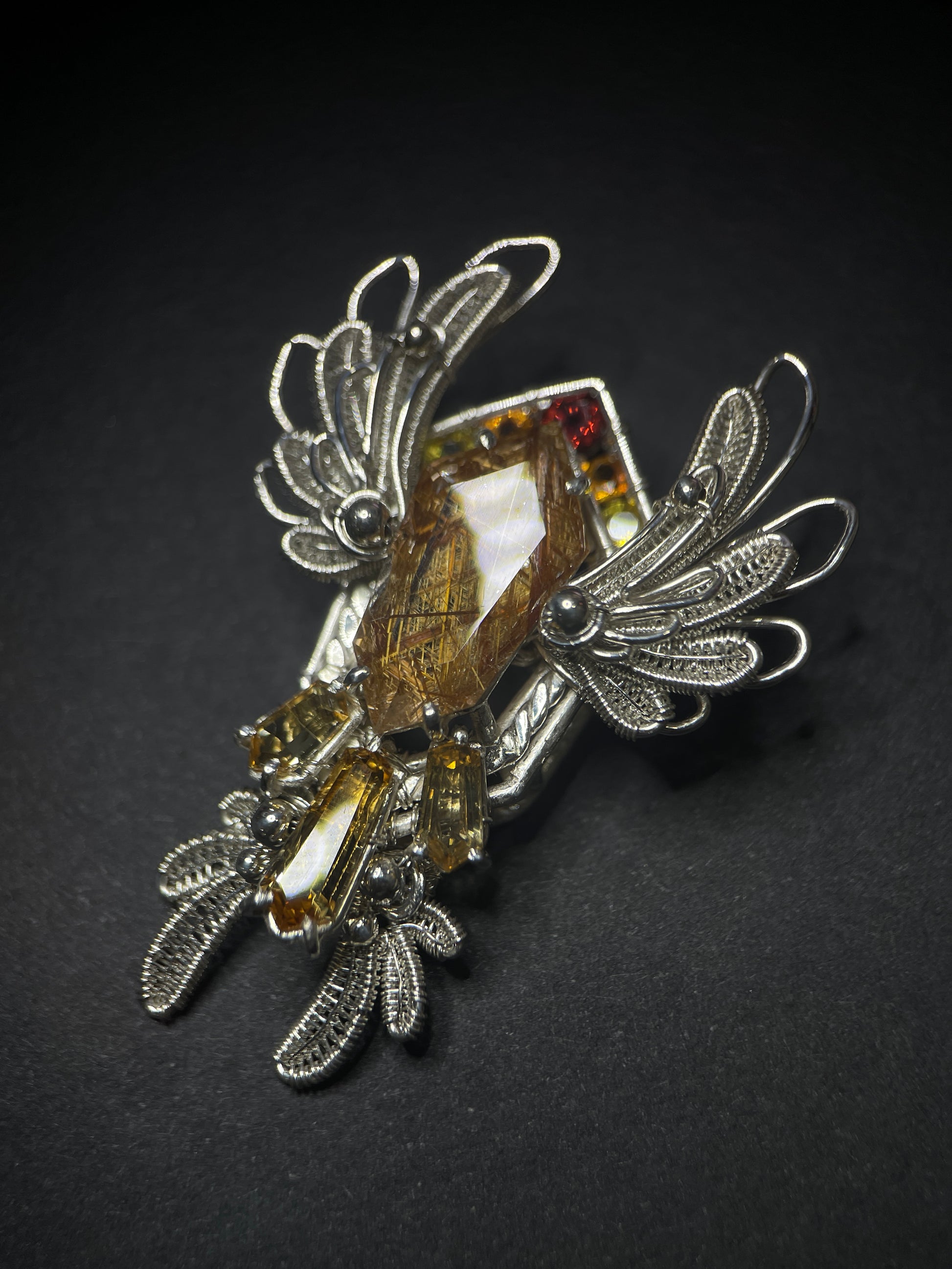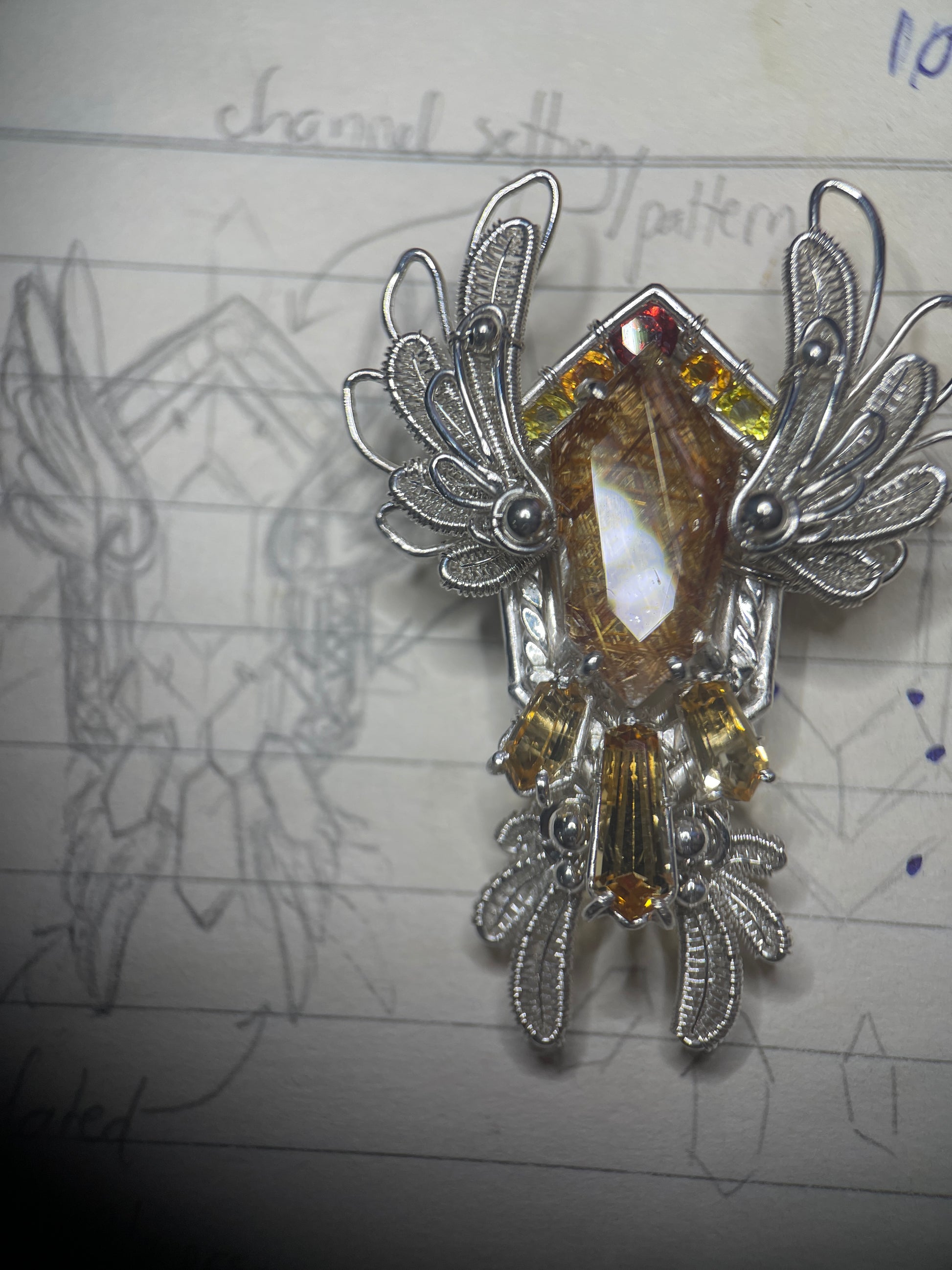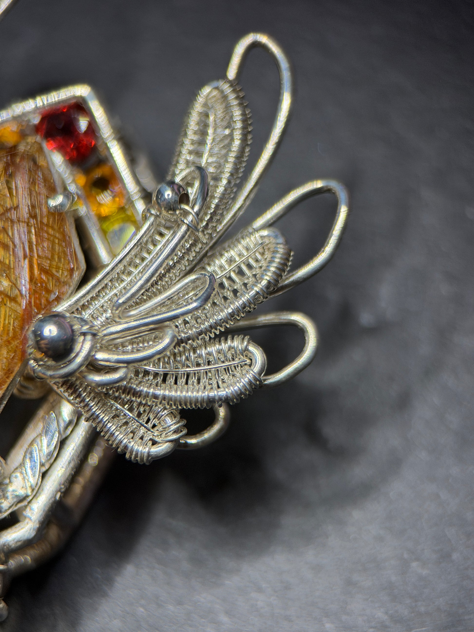 Celestial Guardian – Handmade Sterling Silver Wire wrap Pendant/Brooch with Rutilated Quartz, Citrine & Sapphire