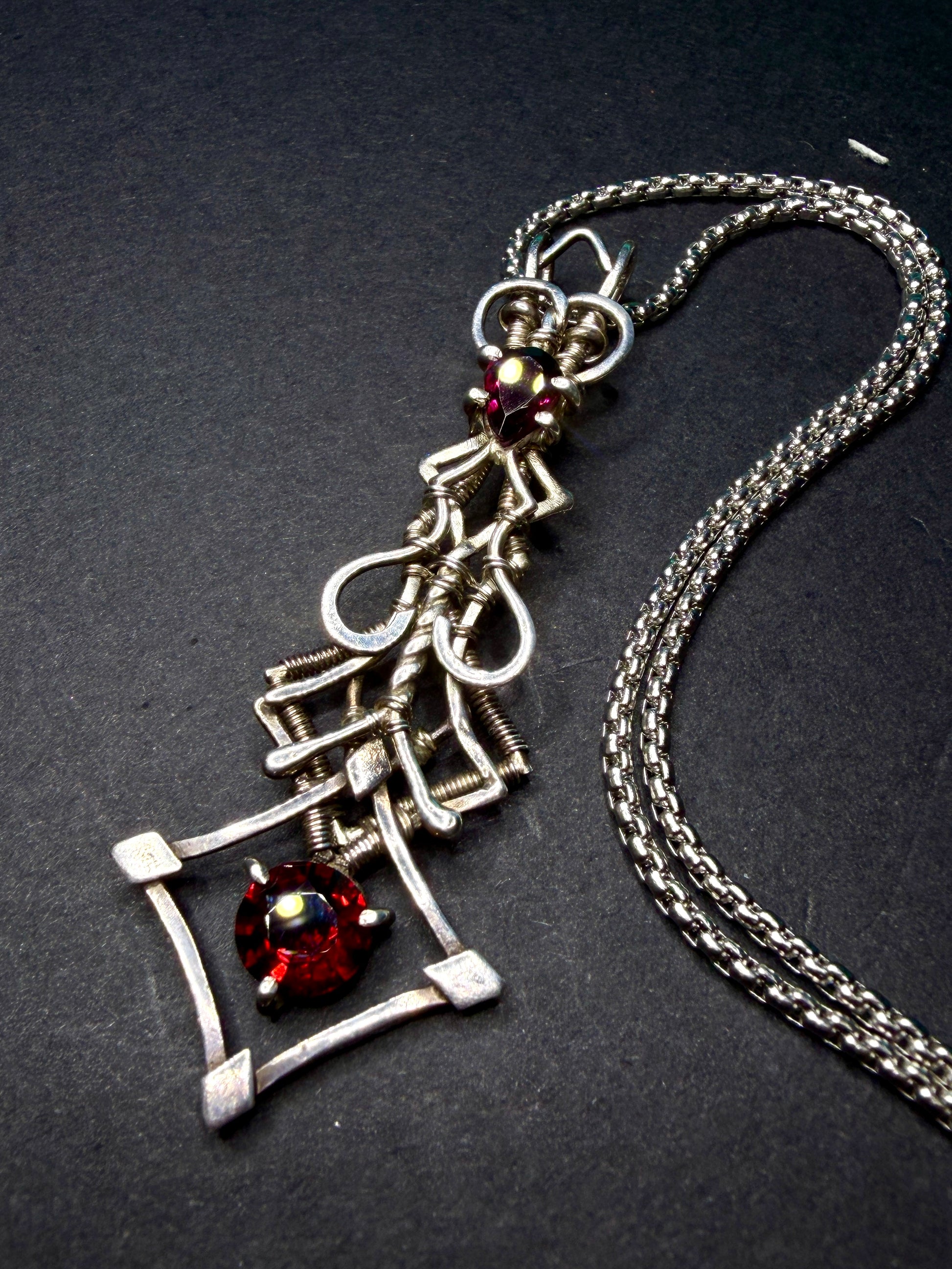 Red and purplish Garnets are integrated into the design, adding a rich, jewel-toned warmth that enhances the pendant’s old-world charm. Their deep glow brings life to the silver, like rubies embedded in a timeless mechanism.
