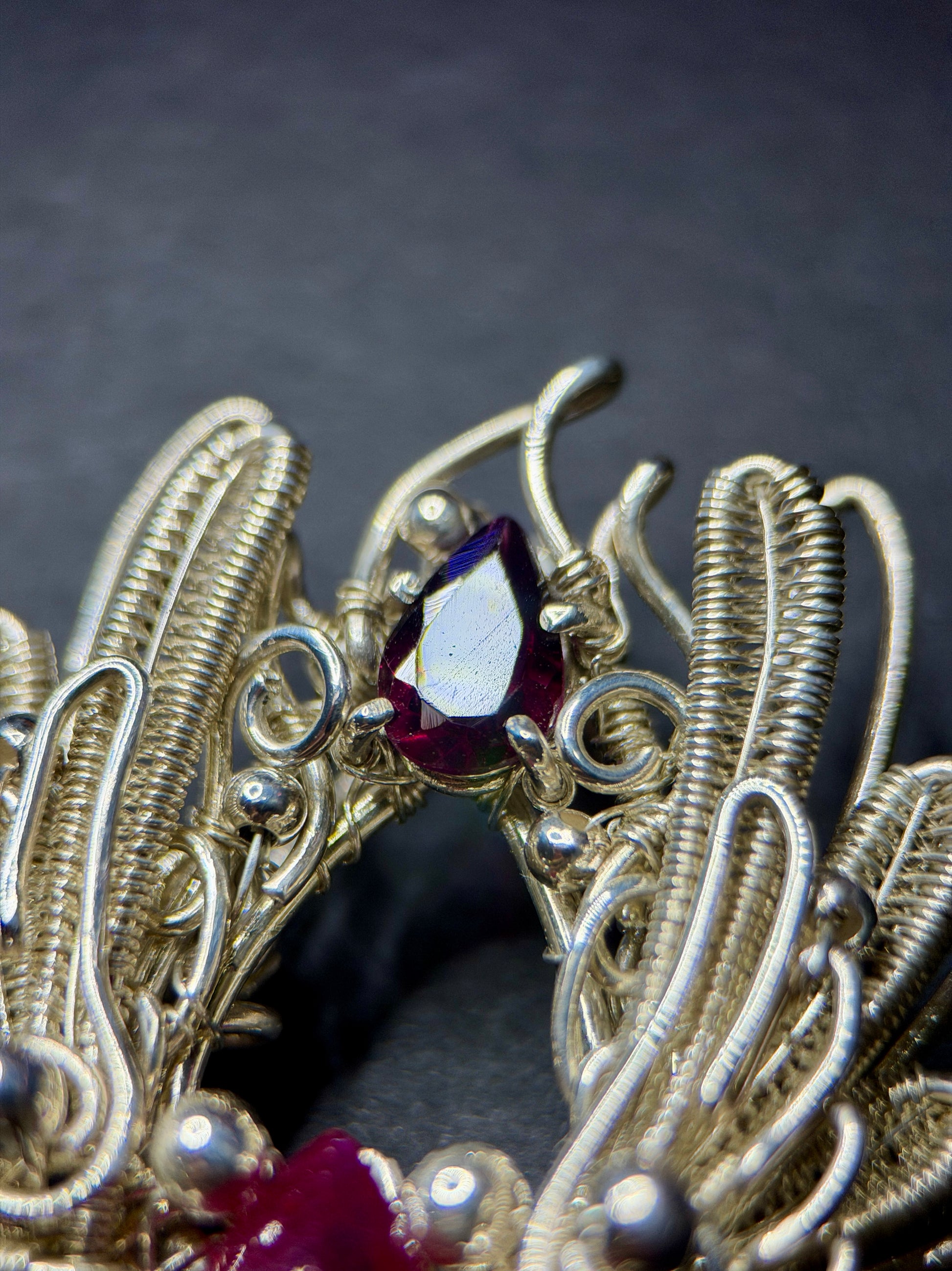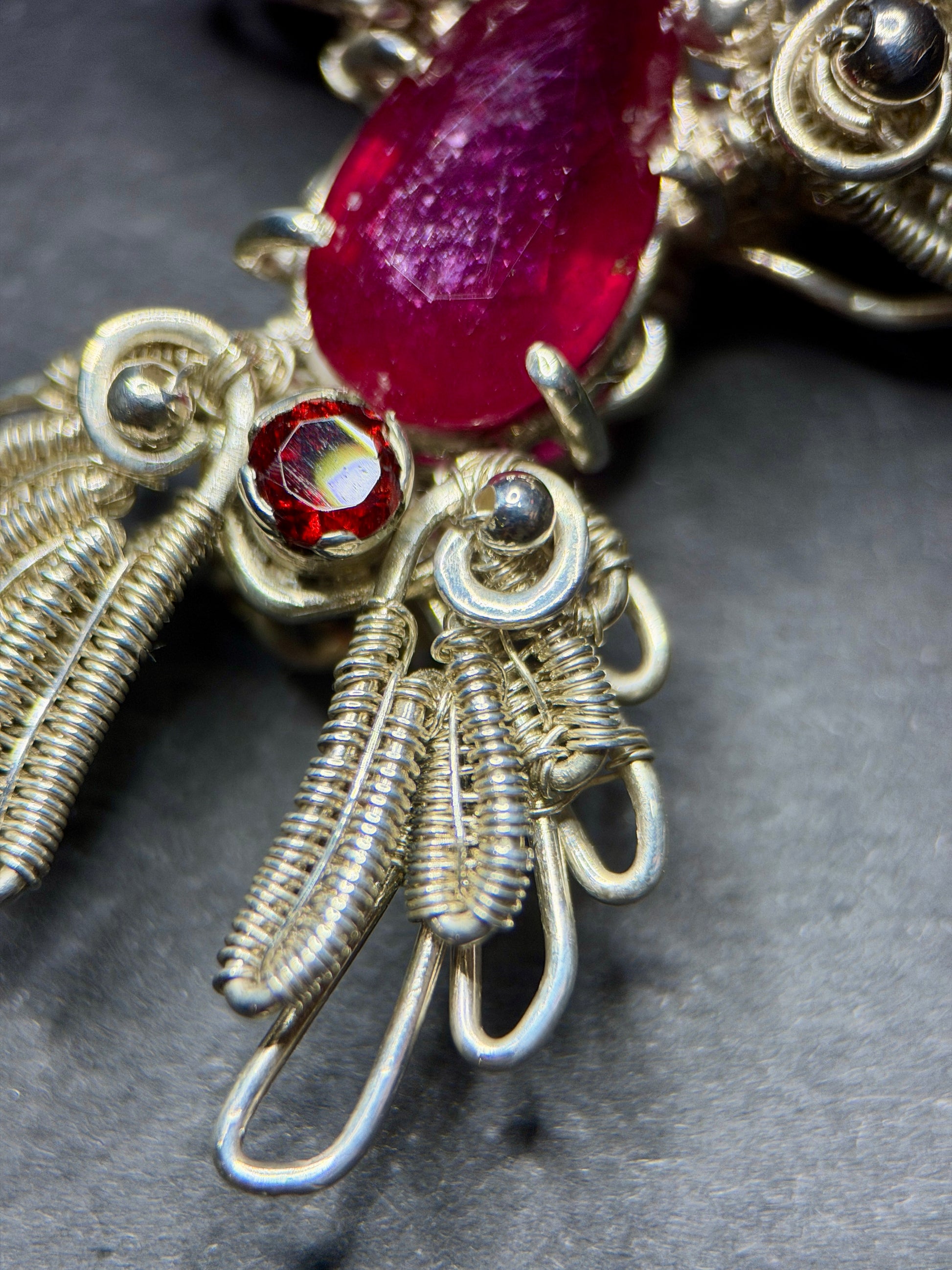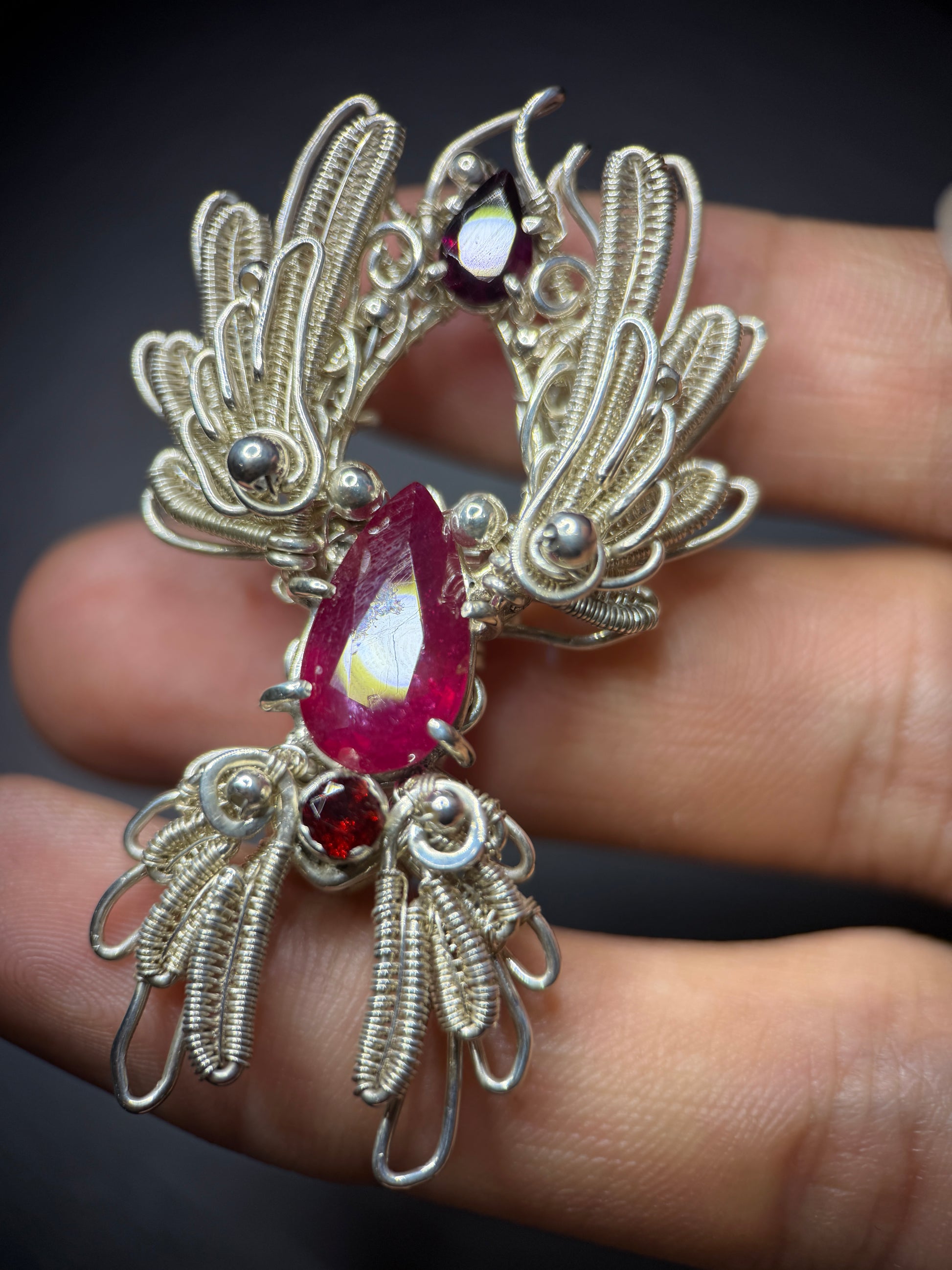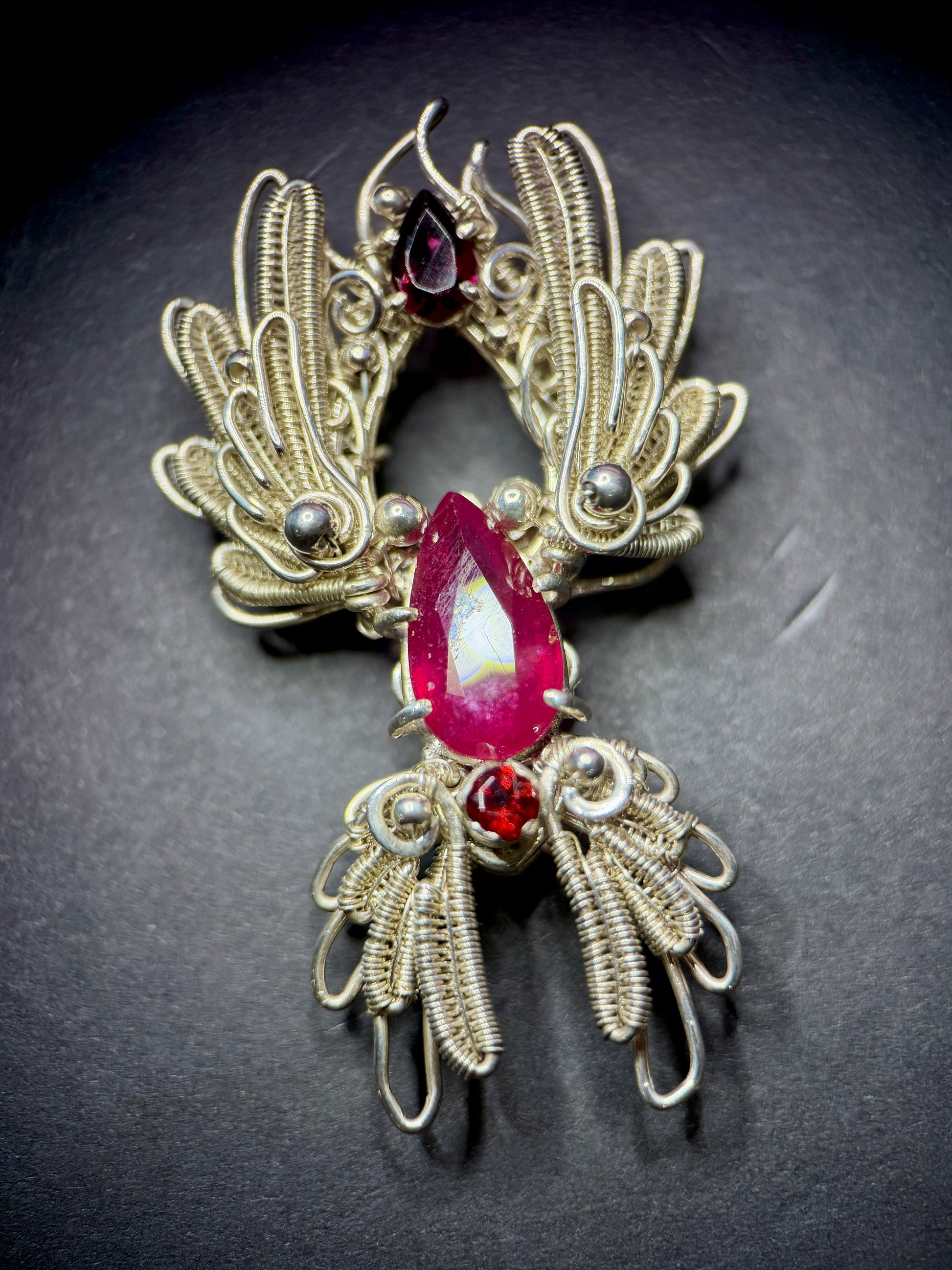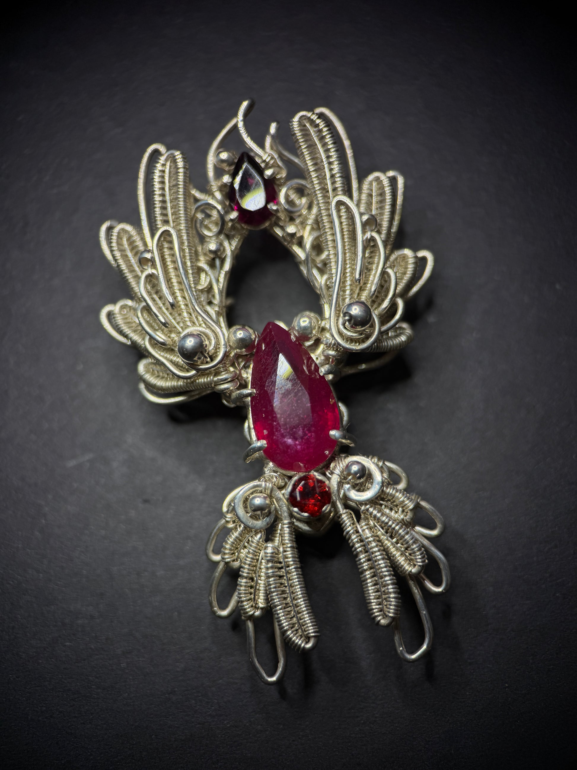 At the center is a pear-shaped ruby, flanked by two rich garnets that intensify the heat of the design. The vibrant reds contrast beautifully against the cool tones of sterling silver, creating a dramatic and harmonious balance. Every detail was meticulously hand-wrapped, resulting in a piece that is both intricate and emotionally resonant.