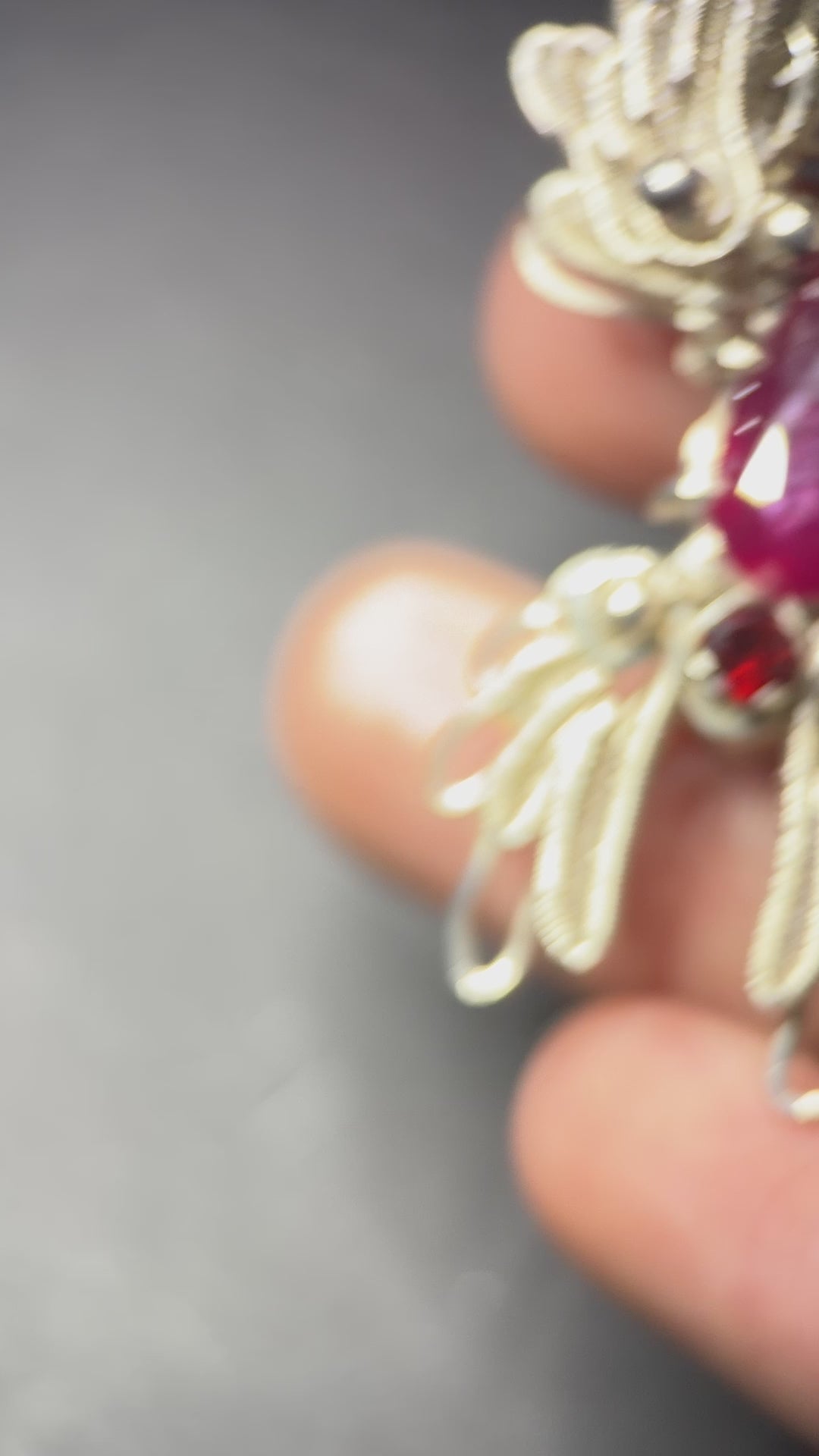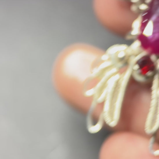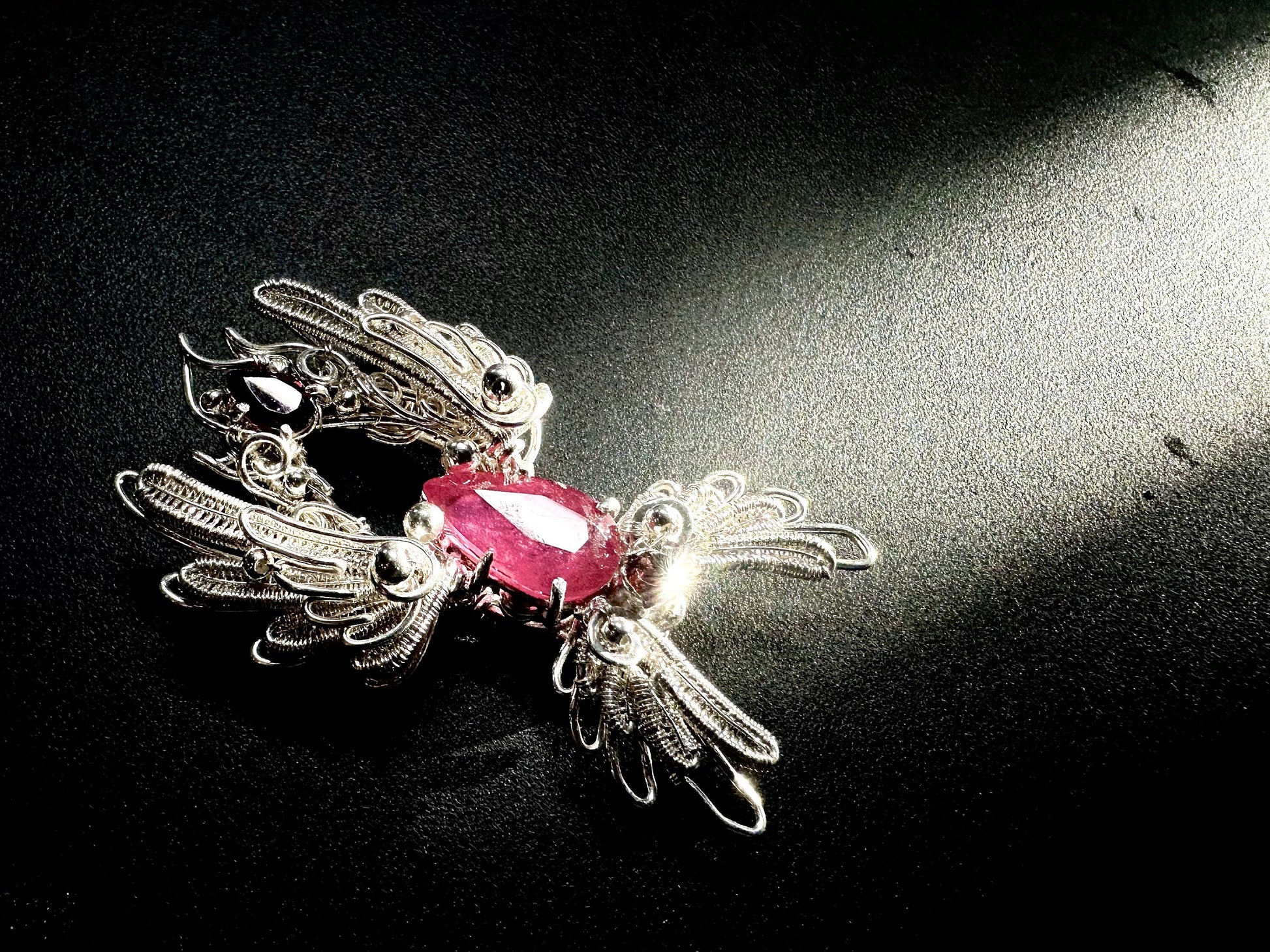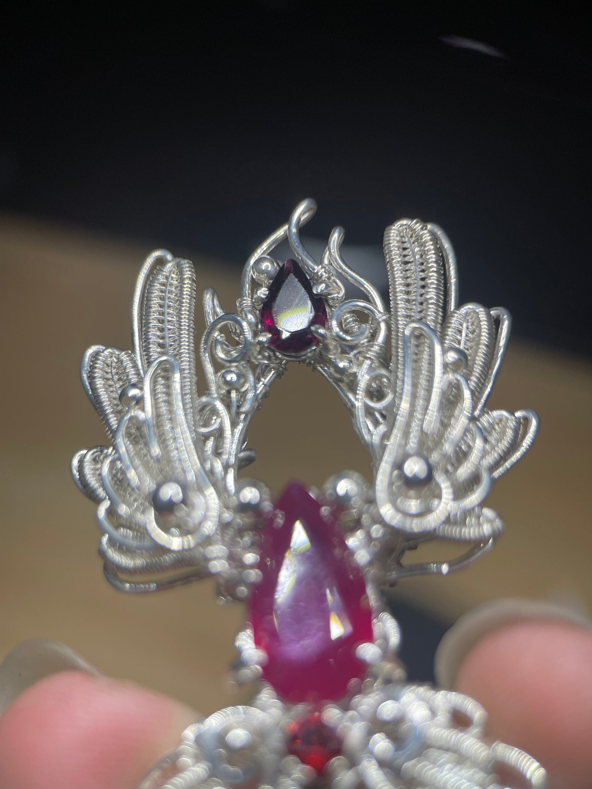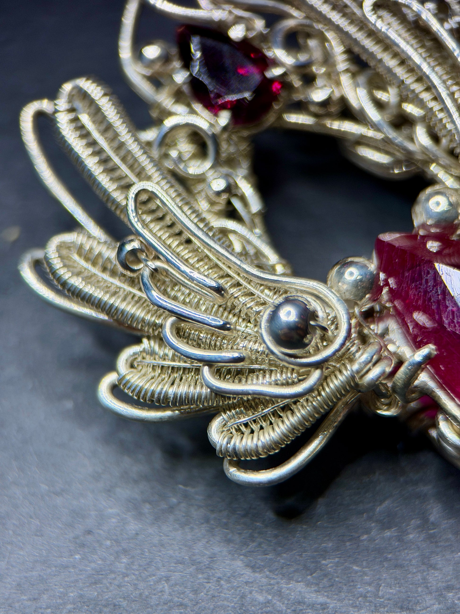 At the center is a pear-shaped ruby, flanked by two rich garnets that intensify the heat of the design. The vibrant reds contrast beautifully against the cool tones of sterling silver, creating a dramatic and harmonious balance. Every detail was meticulously hand-wrapped, resulting in a piece that is both intricate and emotionally resonant.